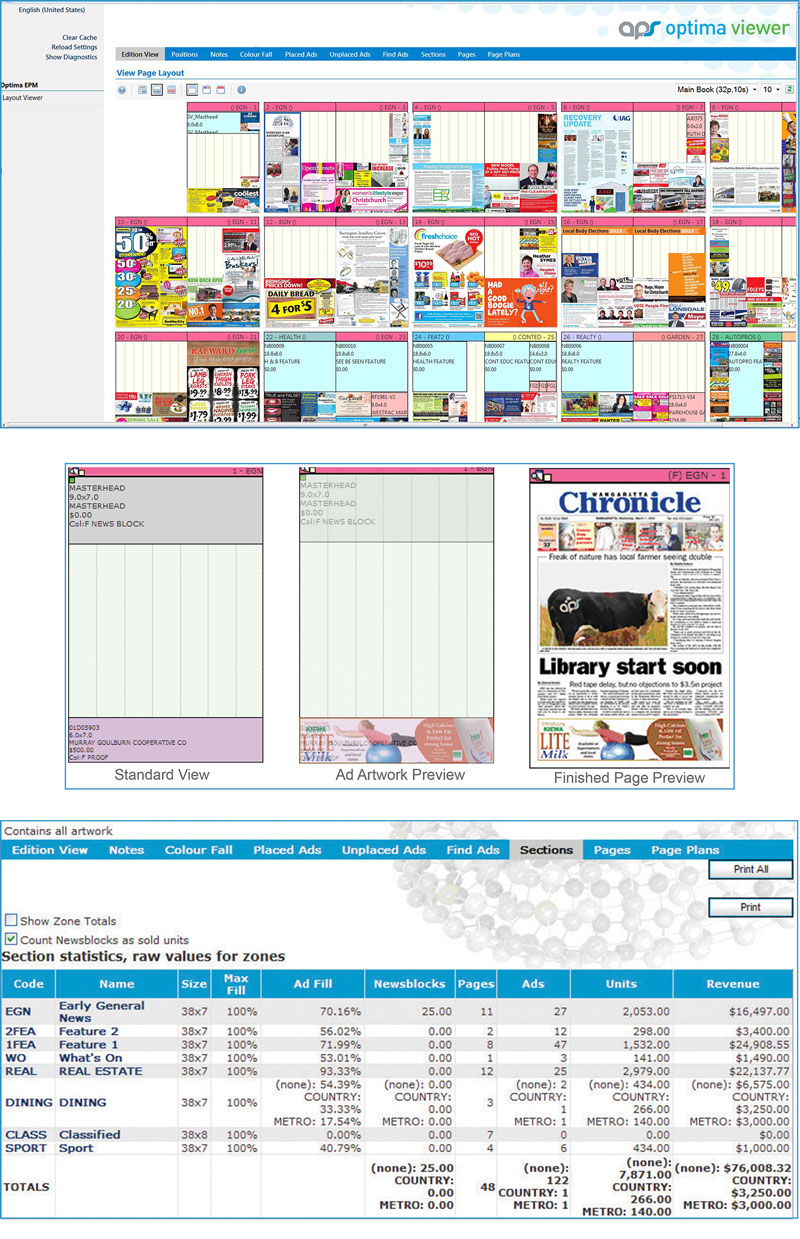 Optima Viewer can be integrated with artwork management & tracking tools to provide detailed material instructions, copy status & live previews of each advertisement in the layout.